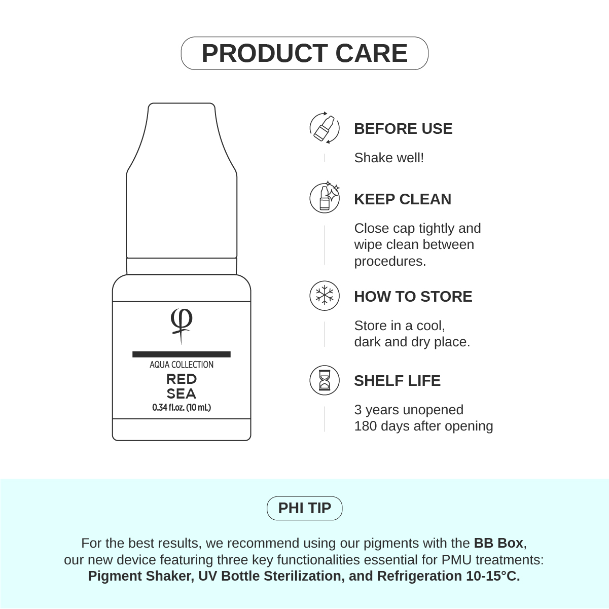 TIP PHI: Pre dosiahnutie najlepších výsledkov používajte s BB Boxom, ktorý obsahuje Pigment Shaker, UV sterilizáciu fľaše a chladenie pri teplote 10 – 15 °C.