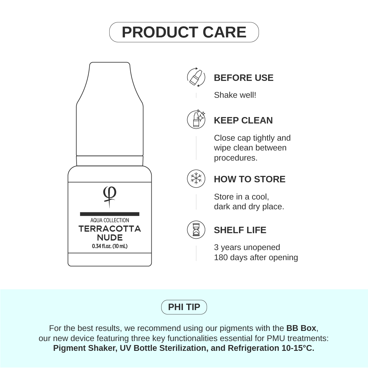 Terracotta Nude je všestranný pigment na vodnej báze, ktorý sa dá použiť samostatne alebo zmiešať na vytvorenie vlastných odtieňov. Je určený pre techniky PMU pier a vhodný aj na pigmentáciu dvorcov pier. Jeho vysoko pigmentované zloženie zaisťuje dlhotrvajúcu farbu s vynikajúcou fixáciou.